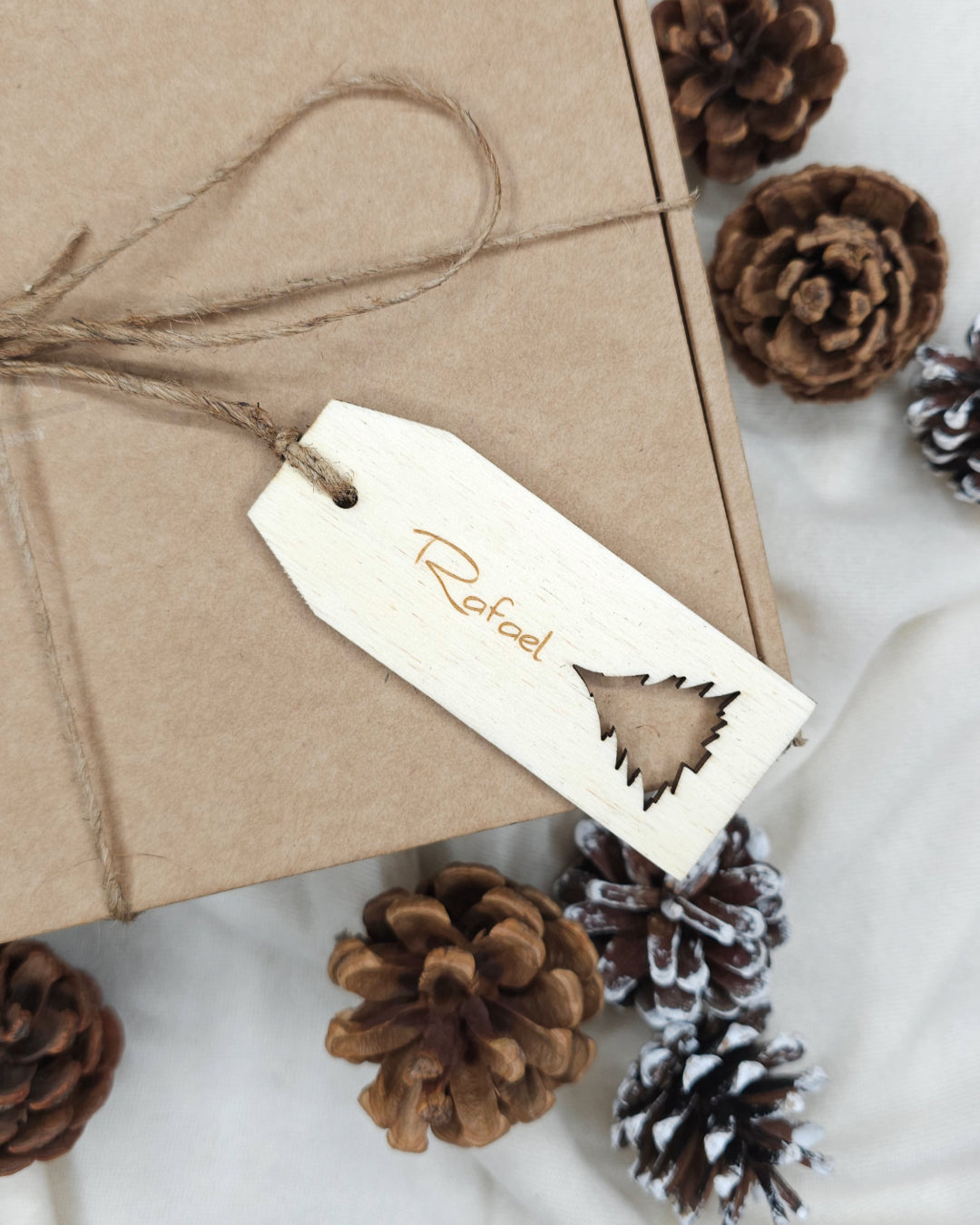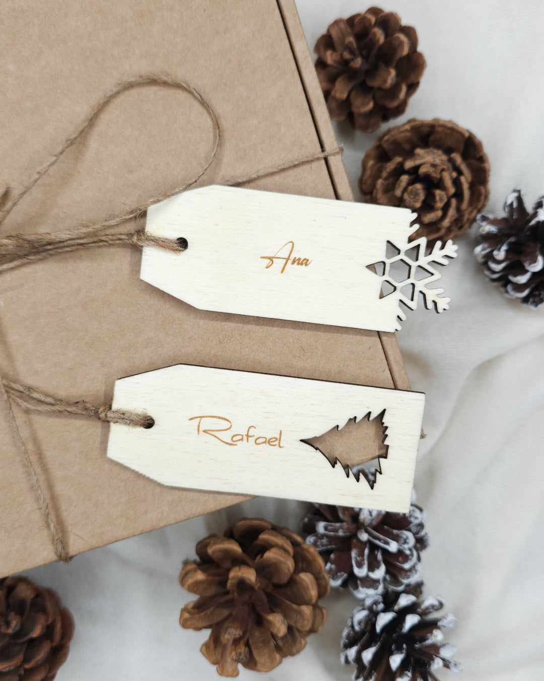 Dê um toque especial aos seus presentes de Natal com estas etiquetas de madeira personalizadas. Elegantes e sustentáveis, são perfeitas para identificar os presentes de uma forma única e inesquecível. Escolha o nome e adicione um detalhe encantador com formatos festivos! 🎄
